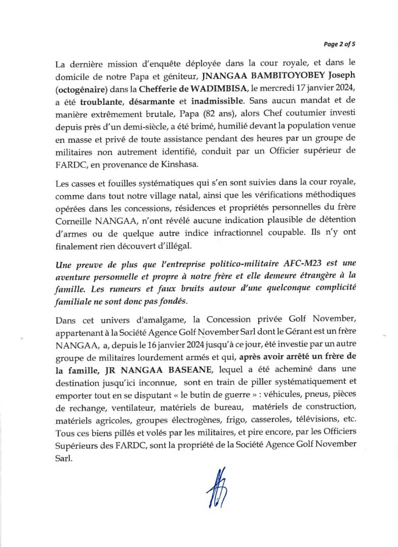 Selon cette lettre, l’on confond la famille Nangaa toute entière et M. Corneille Nanga qui n’est que l’un des membres de cette famille et qui est aujourd’hui engagé dans « une optique révolutionnaire ». La famille Nangaa rejette donc les allégations selon lesquelles elle serait impliquée dans l’initiative de M. Corneille Nangaa qui a d’ailleurs créé un groupe armé.