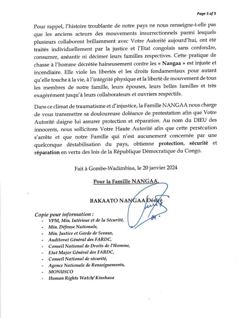 Dans une lettre ouverte adressée, samedi 20 décembre 2024, au Président de la République, la famille Nangaa dit vivre dans une insécurité généralisée qui risquerait d’entrainer son extermination sur fond, je cite, « de la confusion intentionnellement entretenue par certains acteurs politiques mus par une volonté de manifeste de la nuire », fin de citation.