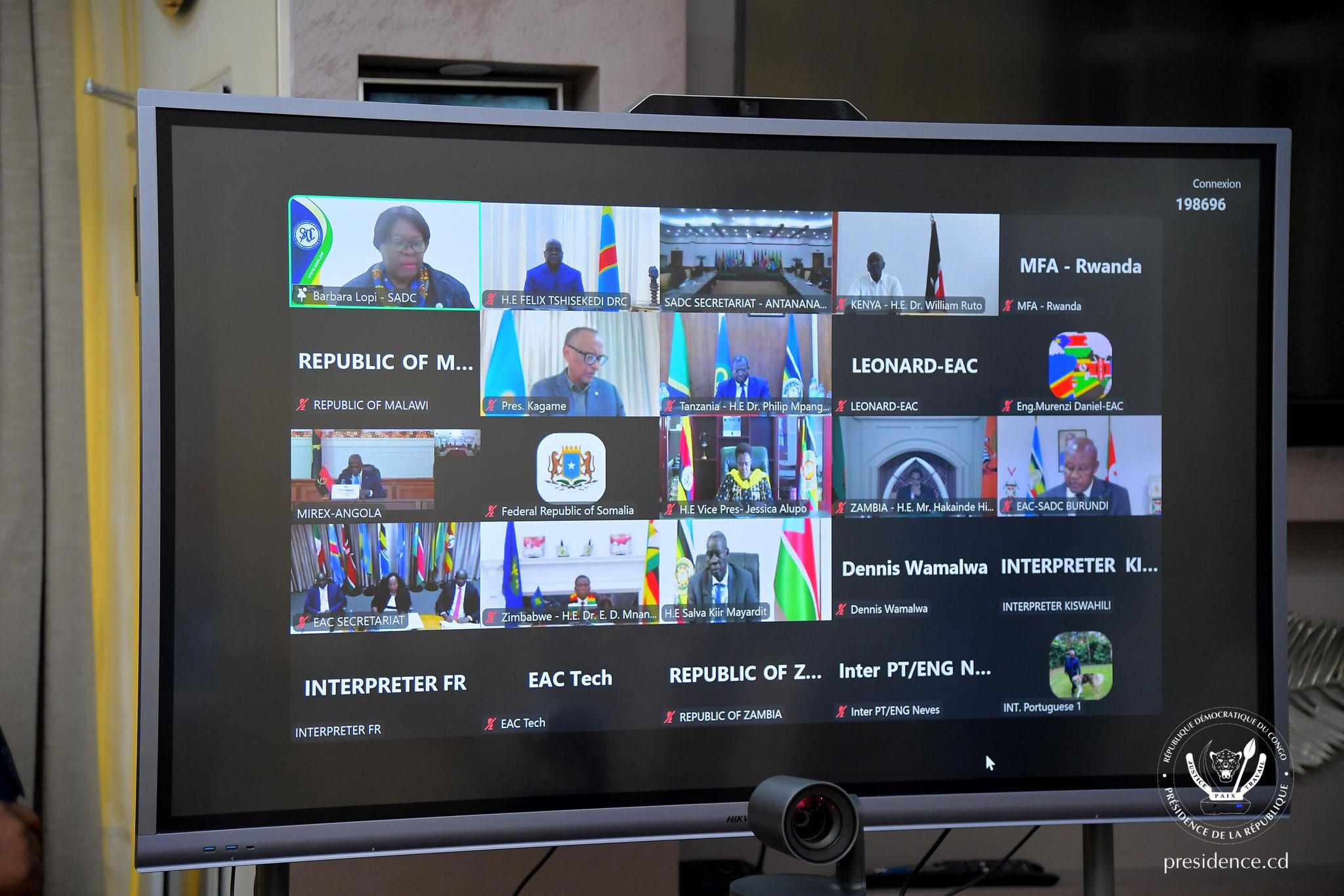 Aux côtés de Tshisekedi, plusieurs chefs d’État ont pris part à cette session virtuelle, dont les présidents du Kenya, du Rwanda, de la Zambie et du Zimbabwe. L’Ouganda et le Burundi étaient représentés par leurs vice-présidents respectifs, tandis que l’Angola, Madagascar et la Somalie ont délégué leurs ministres des Affaires étrangères.