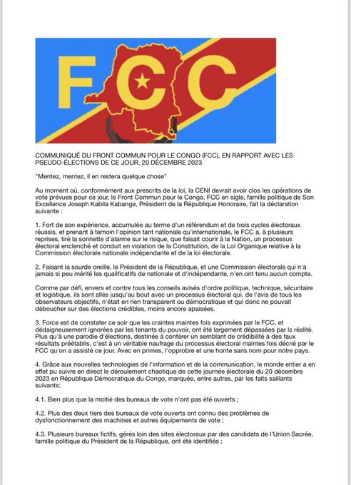 « …Force est de constater ce soir (20 décembre) que les craintes maintes fois exprimées par le FCC, et dédaigneusement ignorées par les tenants du pouvoir, ont été largement dépassées par la réalité. Plus qu’à une parodie d’élections, destinée à conférer un semblant de crédibilité à des faux résultats préétablis, c’est à un véritable naufrage du processus électoral maintes fois décrié par le FCC qu’on a assisté ce jour. Avec en prime, l’opprobre et une honte sans nom pour notre pays… », a déclaré Raymond Tshibanda qui signe cette déclaration.