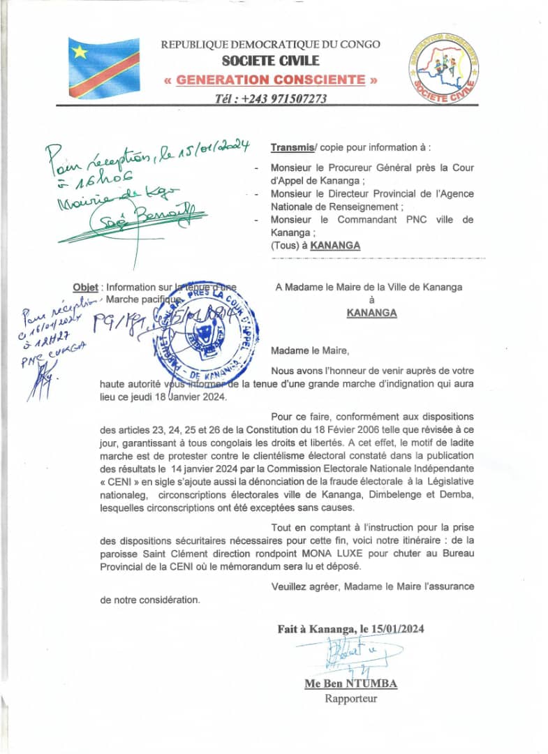 Dans une lettre d’information adressée au maire de la ville de Kananga signée par le rapporteur de cette structure de la société civile Ben Ntumba dont la copie est parvenue à notre rédaction, la génération consciente s’indigne des résultats publiés par la CENI le 14 janvier 2024 pour la province du Kasaï-Central.