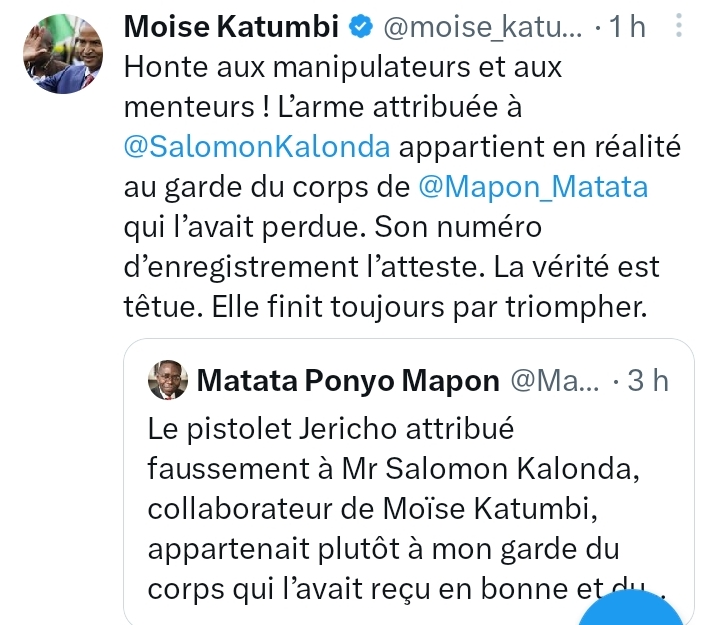 Moïse Katumbi a réagi ce mercredi, à travers son compte Twitter, au sujet de l’affaire de son conseiller spécial. Et ce, après la révélation de Matata Ponyo selon laquelle l’arme attribuée à Salomon Kalonda par les services de Renseignement militaires appartenait à son garde du corps.