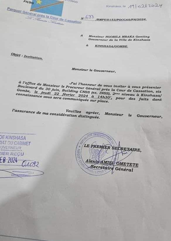 Selon une information recueillie par la rédaction Congopresse.net, les faits pour lesquels l’autorité urbaine est convoquée lui seront notifiés sur place, comme le stipule la note du premier Secrétaire du parquet général près la Cour de cassation.