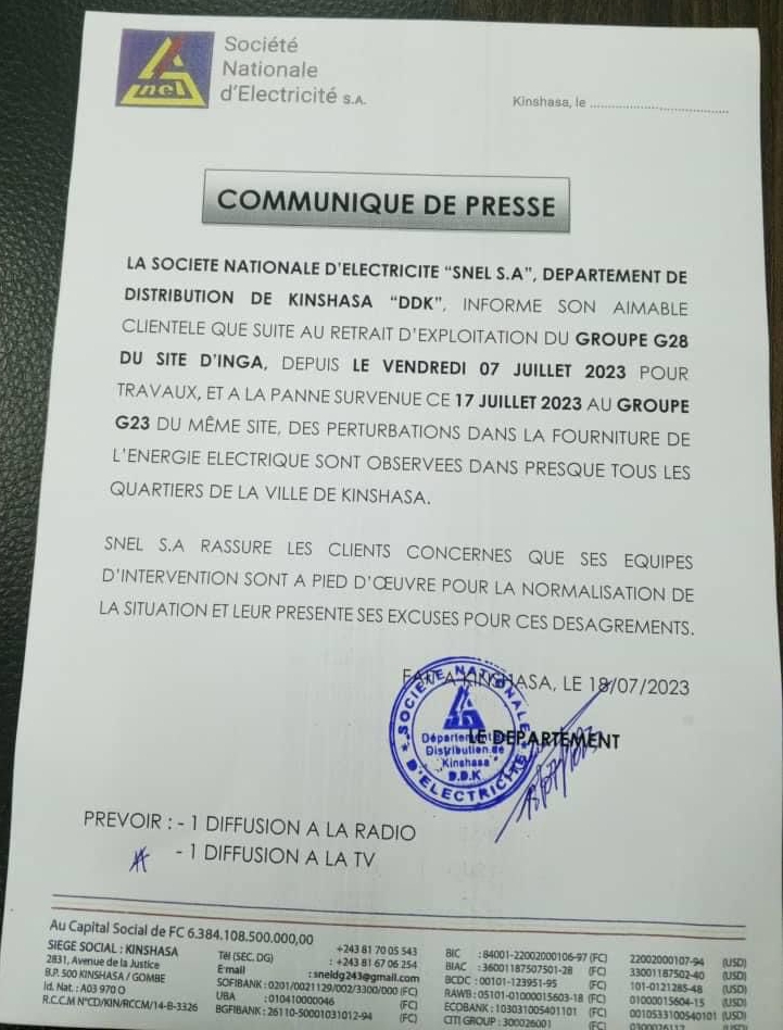 “La SNEL, Direction de Distribution de Kinshasa (DDK) informe son aimable clientèle que suite au retrait d’exploitation du groupe G28 du site d’Inga de le vendredi 07 juillet 2023 pour travaux, et à la panne survenue ce lundi 17 juillet 2023, au groupe G23 du même site, des perturbations dans la fourniture de l’électricité sont observées dans presque tous les quartiers de la ville de Kinshasa », peut-on lire dans ce communiqué.