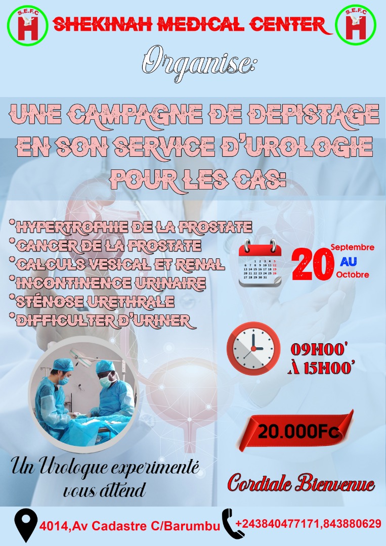 Le centre hospitalier “Shekinah Medical Center” annonce l’organisation d’une campagne de dépistage en son service d’urologie le lundi 20 septembre prochain à Kinshasa. Et ce, à 20.000 FC équivalent de 10 dollars américains.