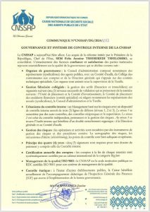 Le Directeur Général de la Caisse Nationale de la Sécurité Sociale des Agents Publics de l’État, CNSSAP en sigle, monsieur Junior Mata M’elanga a rendu public un Communiqué officiel ce vendredi, 09 février 2024, dans lequel il a dévoilé les 8 principaux paramètres qui concourent à la gouvernance et au système de contrôle interne de la CNSSAP.