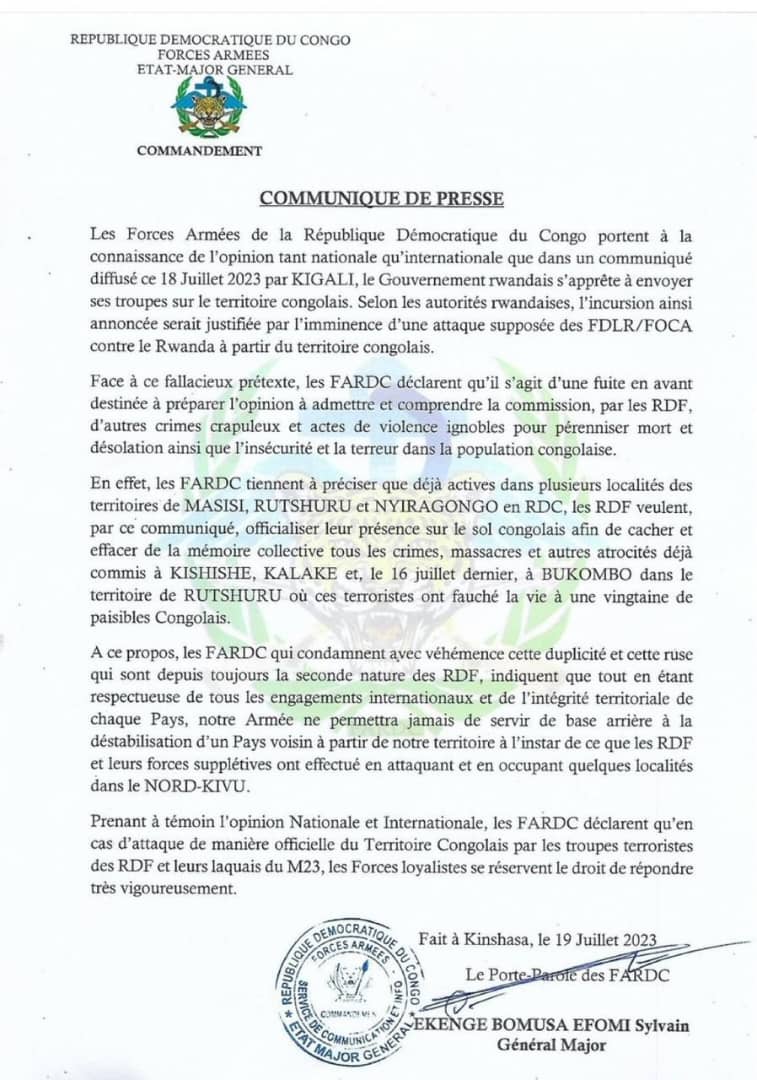 Les Forces Armées de la République Démocratique du Congo (FARDC) annoncent, dans une correspondance ce mercredi 19 juillet, que le Rwanda s’apprête à déployer ses troupes sur le territoire congolais.