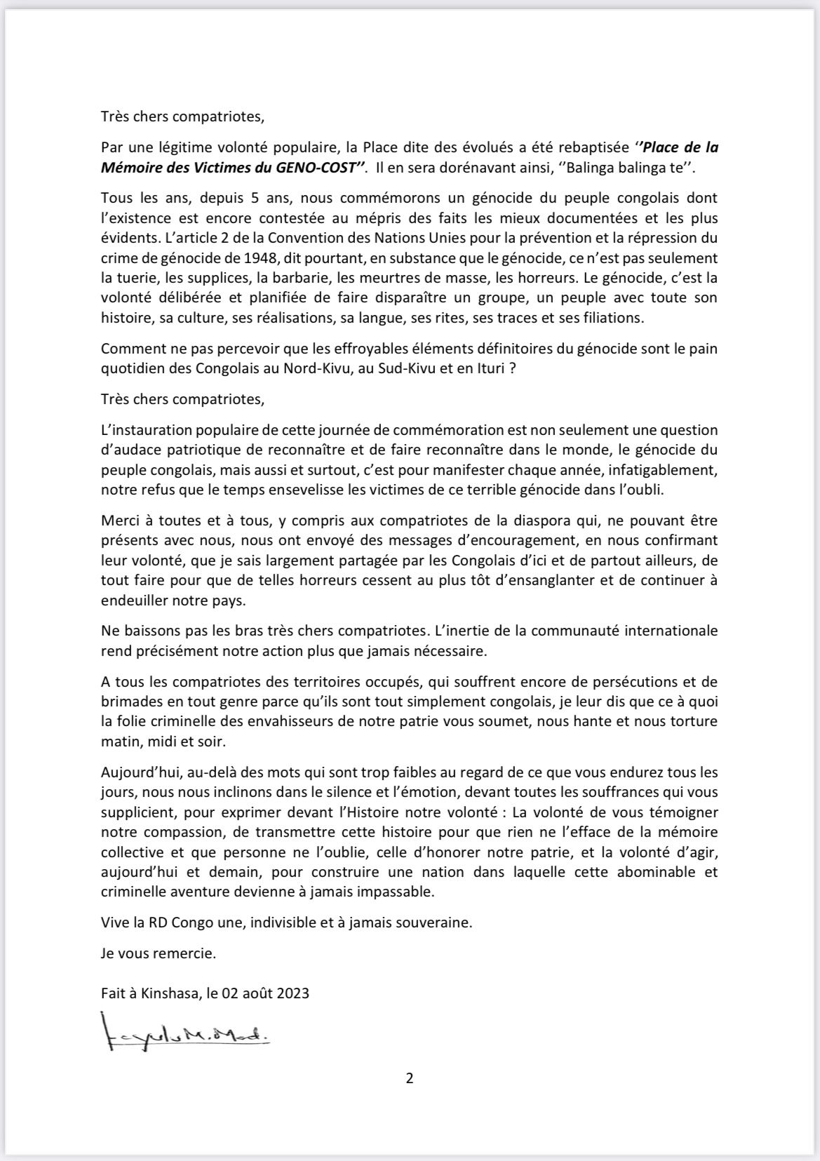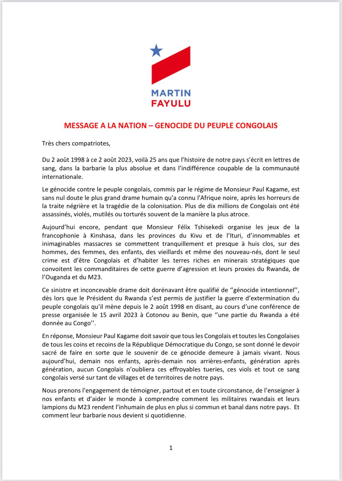 « Le génocide contre le peuple congolais, commis par le régime de Monsieur Paul Kagame, est sans nul doute le plus grand drame humain qu’a connu l’Afrique noire, après les horreurs de la traite négrière et la tragédie de la colonisation. Plus de dix millions de Congolais ont été assassinés, violés, mutilés ou torturés souvent de la manière la plus atroce », a écrit Martin Fayulu dans son message adressé à la « Nation ».