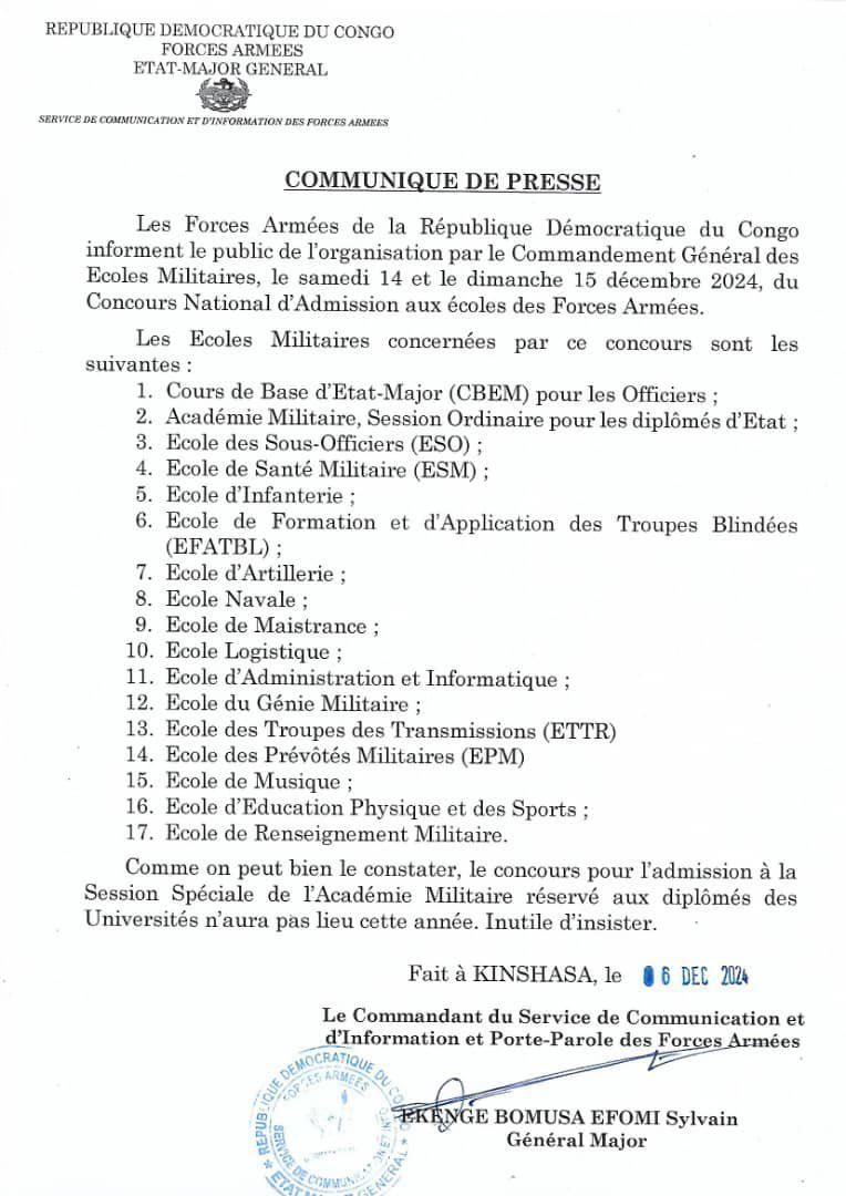 Les Forces Armées de la République Démocratique du Congo (FARDC) informent le public de l’organisation, par le commandement Général des Écoles Militaires, d’un concours national d’admission aux écoles militaires. Ce concours se déroulera le samedi 14 et le dimanche 15 décembre 2024, offrant une opportunité unique aux jeunes congolais désireux de servir leur pays au sein des forces armées.