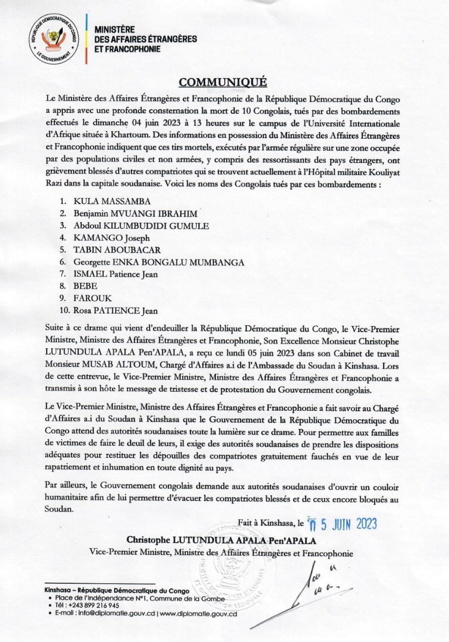 Dix étudiants congolais ont été tués, dimanche 4 juin 2023, à Khartoum (la capitale du Soudan), suite aux bombardements du campus de l’université internationale d’Afrique de Khartoum. C’est le ministre des Affaires étrangères et de la Francophonie qui l’a annoncé dans un communiqué signé lundi.