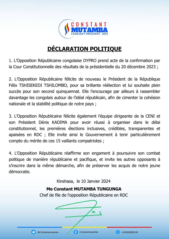 Dans une correspondance publiée, vendredi 2 février 2024, dont une copie est parvenue à la rédaction de Congopresse.Net, le président national du regroupement politique Dynamique Progressiste Révolutionnaire (DYPRO), Constant Mutamba, met en garde le député national Jean-Claude Baende qui a quitté la DYPRO.