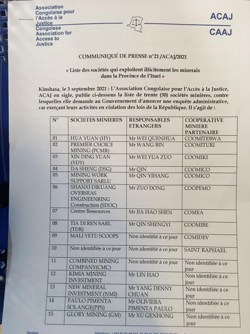 Au cours d’un point de presse organisé ce vendredi 3 septembre à Kinshasa, Me Georges Kapiamba, président de l’ACAJ a publié la liste de 30 sociétés qui exploitent illicitement les minerais dans la province de l’Ituri.